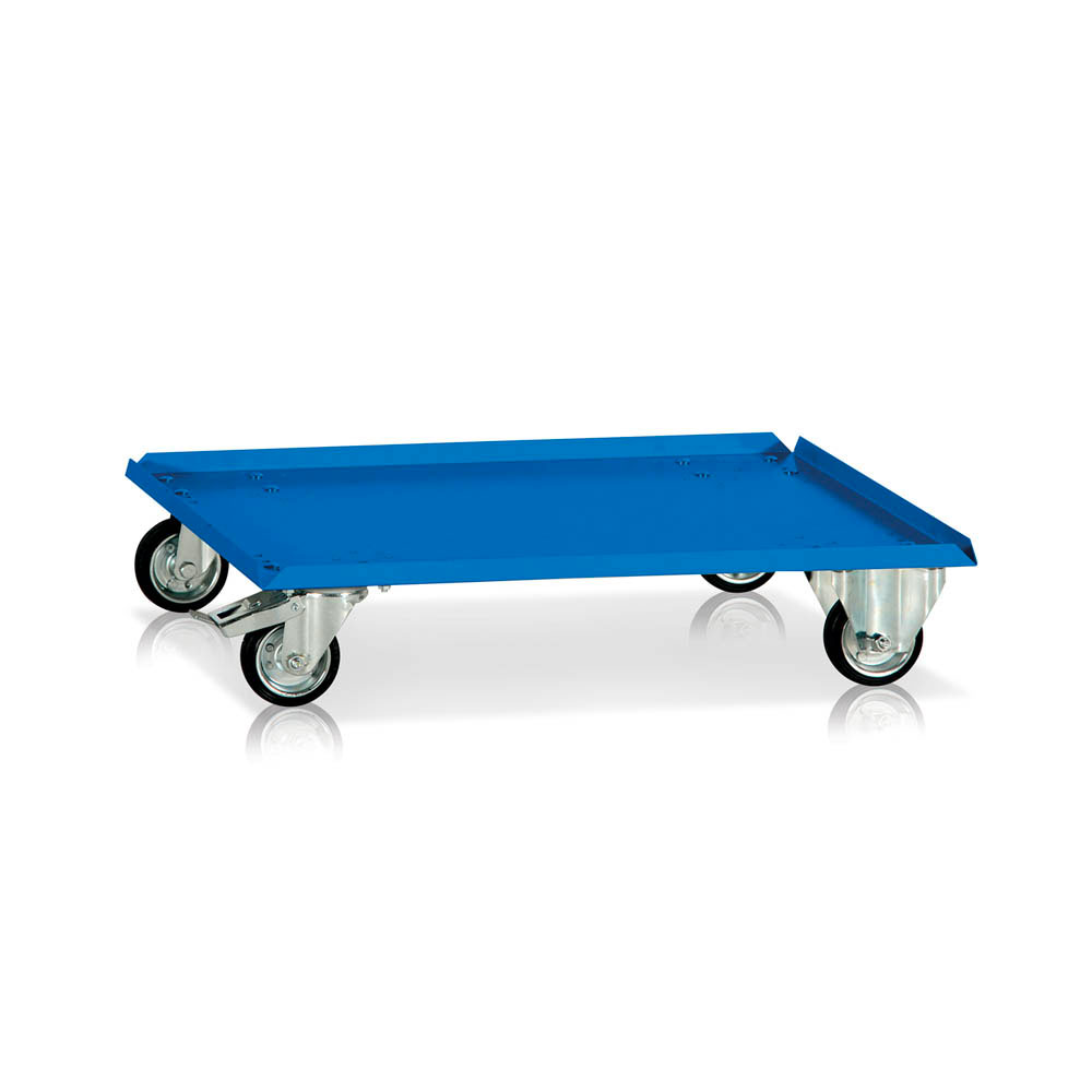 Base in lamiera sp. 15/10 con bordo mm.20h, ruote mm.80 con boccola, 2 fisse e 2 girevoli di cui 1 frenante. Portata kg.150. Verniciatura a polvere blu RAL 5015. Dim.: mm.600x500x130h.