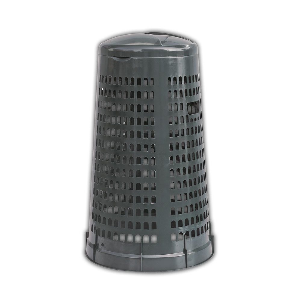 Bidone portasacco con coperchio e anello ferma sacco. Impilabile anche con coperchio. Grigio. Dim.: diametro mm.380/510x850h.