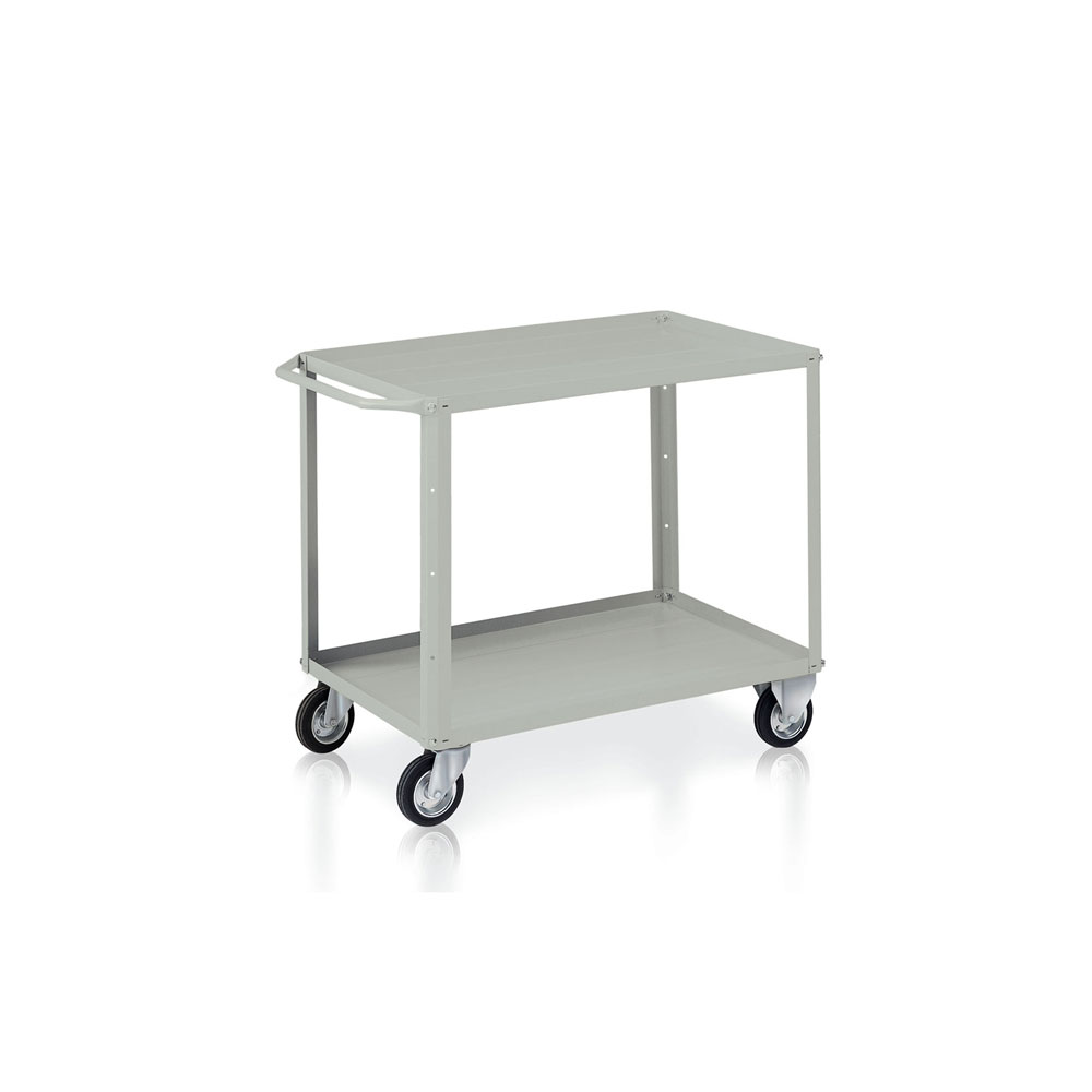 Carrello in lamiera a 2 vasche, ruote mm.140 con cuscinetti a rulli, 2 fisse e 2 girevoli. Portata kg.120 ogni vasca. Portata carrello kg.360. Smontato. Verniciatura a polvere grigio RAL 7038. Dim. carrello: mm.1040x600x865h. Dim. vasca: mm.930x600x30h.