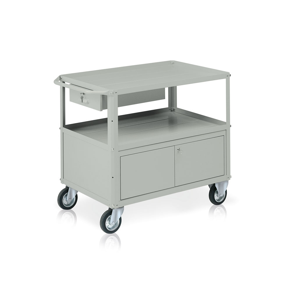 Carrello in lamiera a 3 vasche, 1 baule ed 1 cassetto, ruote mm.140 con cuscinetti a rulli, 2 fisse e 2 girevoli. Portata kg.120 ogni vasca. Portata carrello kg.360. Smontato. Verniciatura a polvere grigio RAL 7038. Dim. carrello: mm.1040x600x865h. Dim. vasca: mm.930x600x30h.