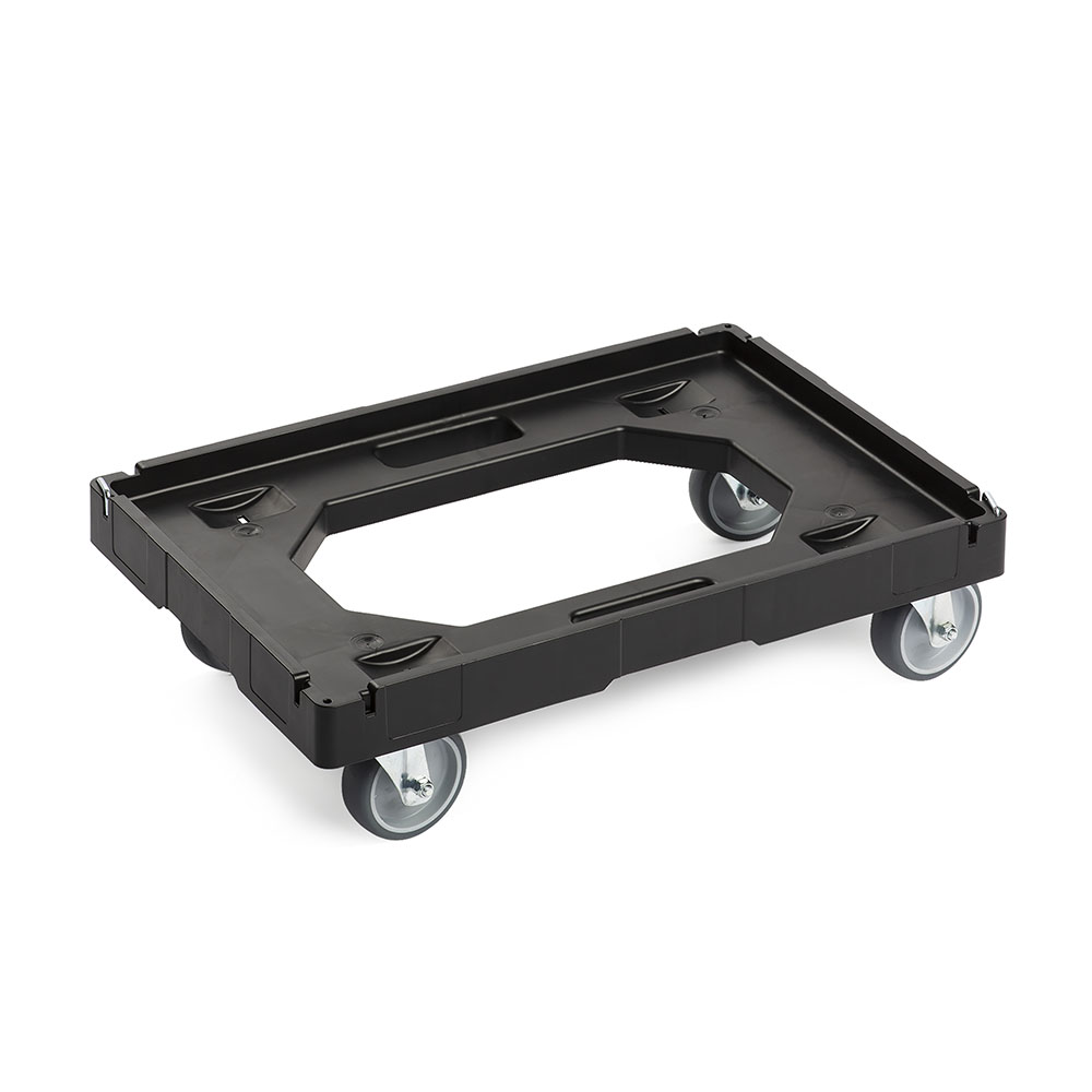 Carrello in polipropilene per il trasporto di cassette in plastica di mm.600x400. Ruote in nylon diam.100 fissate su piastre in acciaio zincato. Impilabile e agganciabile. Portata Kg 250. Nero. Dim.: mm.600x400x173h.