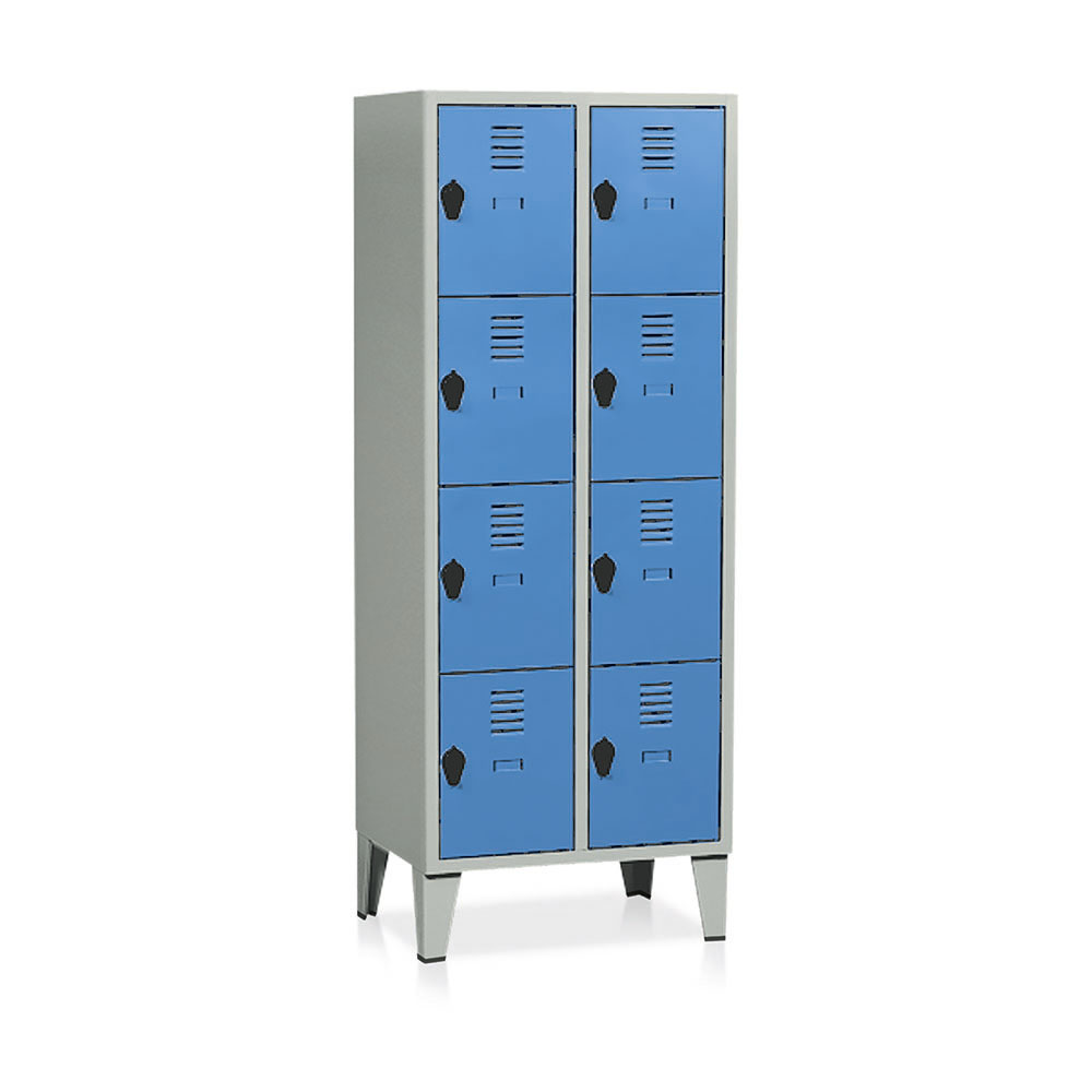 Casellario in lamiera sp. 6-7/10 a 8 vani di mm.320x480x380h. Ante rinforzate e forate per l'aerazione, portacartellino e chiusura con nasello in plastica lucchettabile. Verniciatura a polvere grigio RAL 7038 con ante blu RAL 5015. Dim.: mm.690x500x1800h.