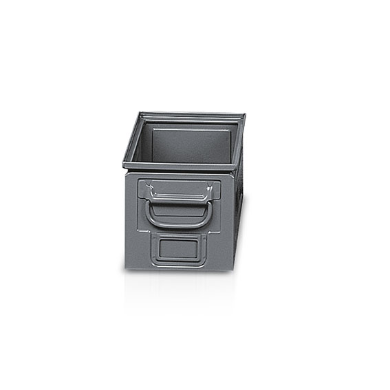 Cassetta in lamiera stampata e sagomata con 2 maniglie snodabili, sovrapponibile 1+4. Portata kg.80. Capacità lt.12. Verniciatura in cataforesi grigio scuro RAL 7000. Dim.: mm.215x318x200h. (G.3) Dim. utili: mm.185x290x184h.