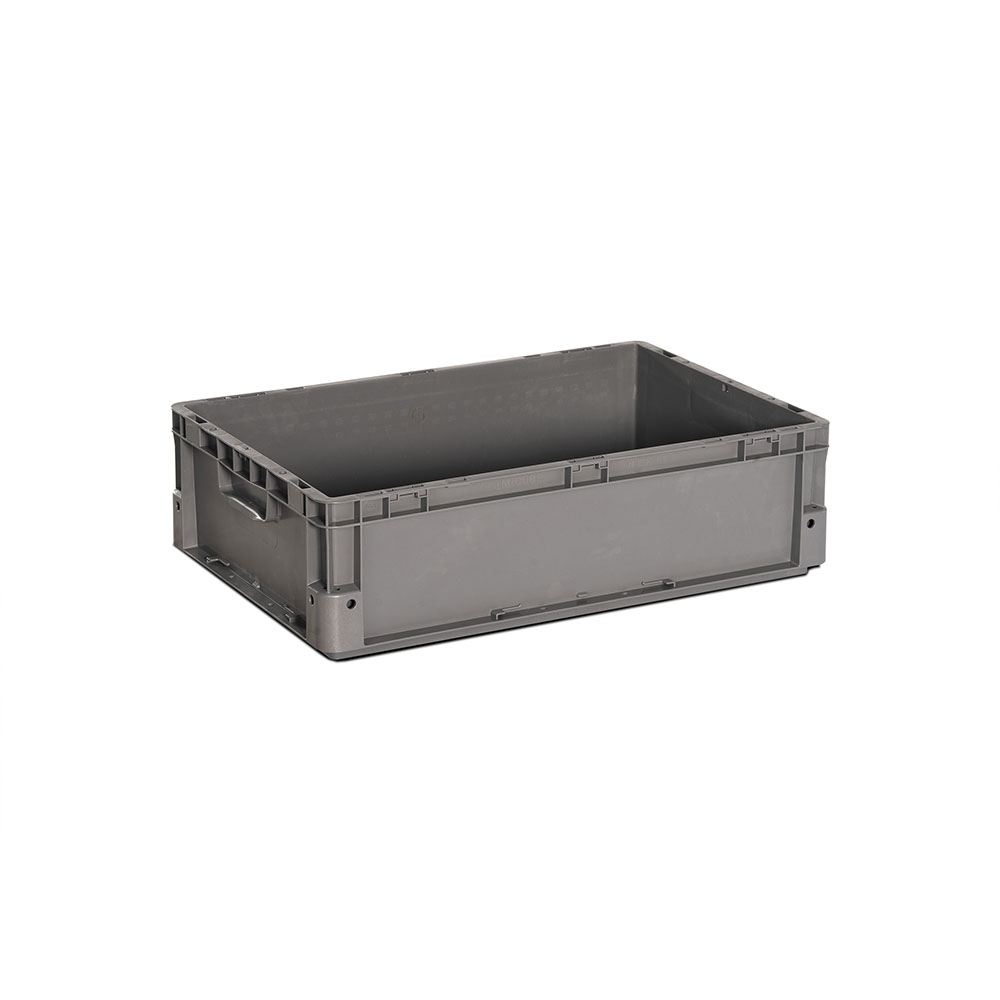 Cassetta sovrapponibile in polipropilene rigenerato antiurto e antiolio, fondo liscio e maniglie chiuse. Capacità lt.34,2. Portata Kg.20. Grigio. Dim.esterne: mm.600x400x170h. Dim.utili: 561x361x167h.