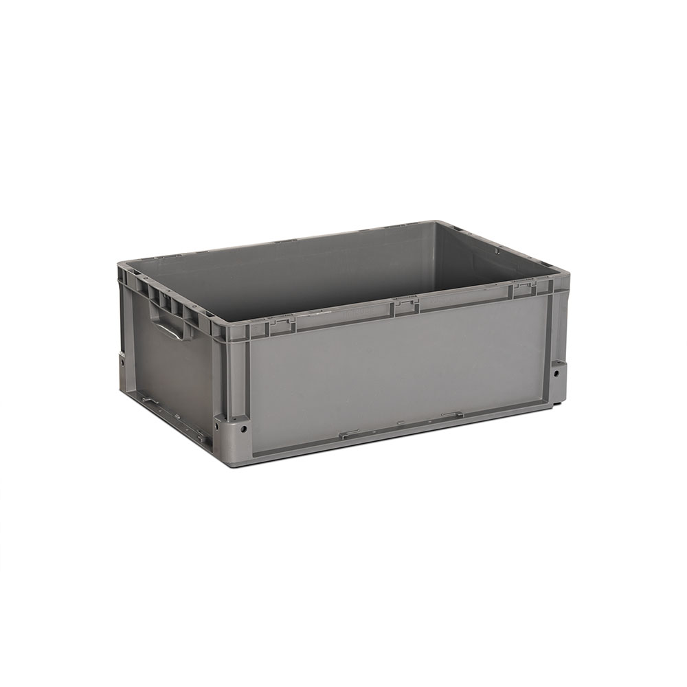 Cassetta sovrapponibile in polipropilene rigenerato antiurto e antiolio, fondo liscio e maniglie chiuse. Capacità lt.44,5. Portata Kg.20. Grigio. Dim.esterne: mm.600x400x220h. Dim.utili: mm.561x361x217h.