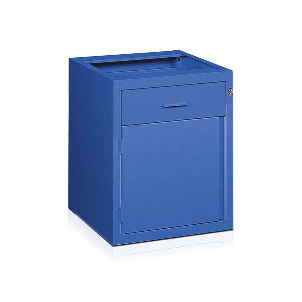 Cassettiera in lamiera per banco da lavoro a 1 cassetto scorrevole su guide con cuscinetti a sfera, 1 cassonetto con pianetto interno fisso, serratura con chiusura simultanea e staffe per aggancio al sottopiano. Verniciatura a polvere blu RAL 5015. Dim.: mm.500x565x620h.