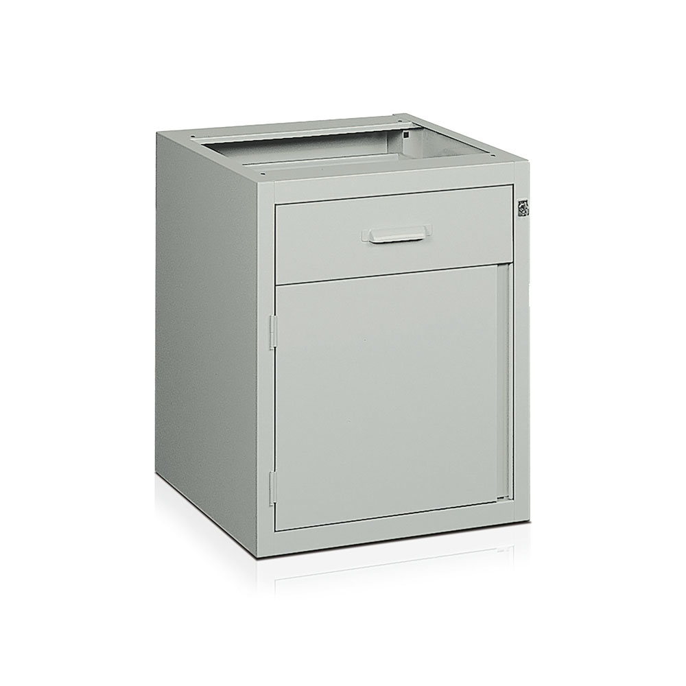 Cassettiera in lamiera per banco da lavoro a 1 cassetto scorrevole su guide con cuscinetti a sfera, 1 cassonetto con pianetto interno fisso, serratura con chiusura simultanea e staffe per aggancio al sottopiano. Verniciatura a polvere grigio RAL 7038. Dim.: mm.500x565x620h.
