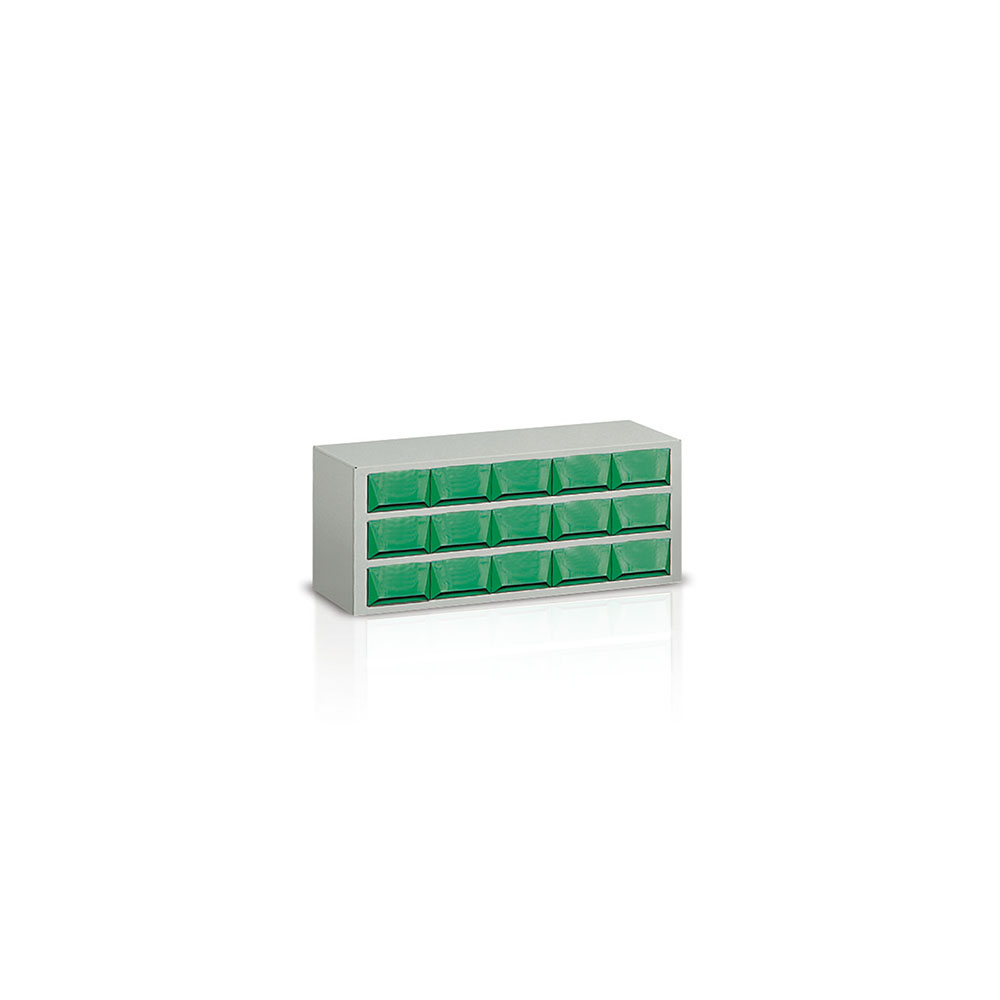 Cassettiera in lamiera sp. 8/10 a 15 cassetti in plastica verde di mm.130x300x70h e 30 separatori. Verniciatura a polvere grigio RAL 7038. Dim.: mm.725x325x306h.