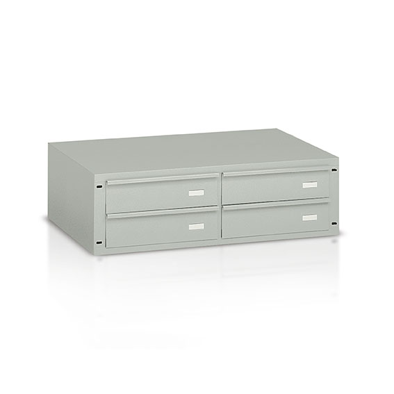 Cassettiera a 4 cassetti di mm.415x450x100h scorrevoli su guide con rulli, 8 separatori ed etichette in cartoncino bianco con protezione in PVC trasparente. Verniciatura a polvere grigio chiaro RAL 7035. Dim.: mm.1000x500x300h.