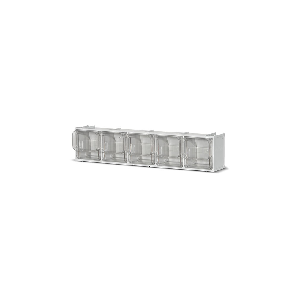 Cassettiera in PET grigio chiaro a 5 cassetti trasparenti mm.95x85x65/95h. Dim. mm.600x133x132h.
