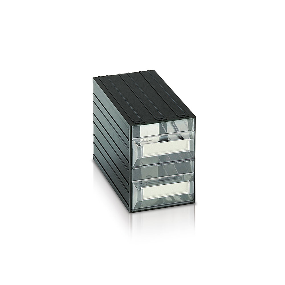Cassettiera in polistirolo antiurto nero con 2 cassetti trasparenti di mm.155x290x103h. corredati di etichetta. Dim.: mm.169x323x226h.