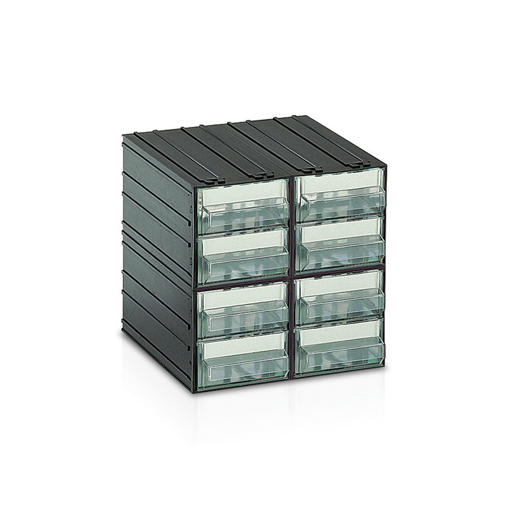 Cassettiera in polistirolo antiurto nero con 8 cassetti trasparenti di mm.101x198x48h. corredati di etichetta e 8 separatori estraibili. Dim.: mm.225x225x225h.