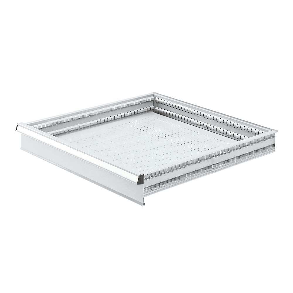 Cassetto in lamiera con frontale mm.100h, estrazione totale 100%. Portata kg,50. Verniciatura a polvere grigio chiaro RAL 7035. Dim. utili: mm.900x450x86h
