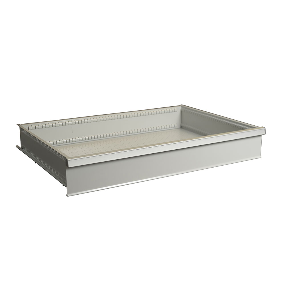 Cassetto in lamiera con frontale mm.75h ad estrazione telescopica. Portata kg.75. Verniciatura a polvere grigio chiaro RAL 7035. Dim. utili: mm.900x600x57h