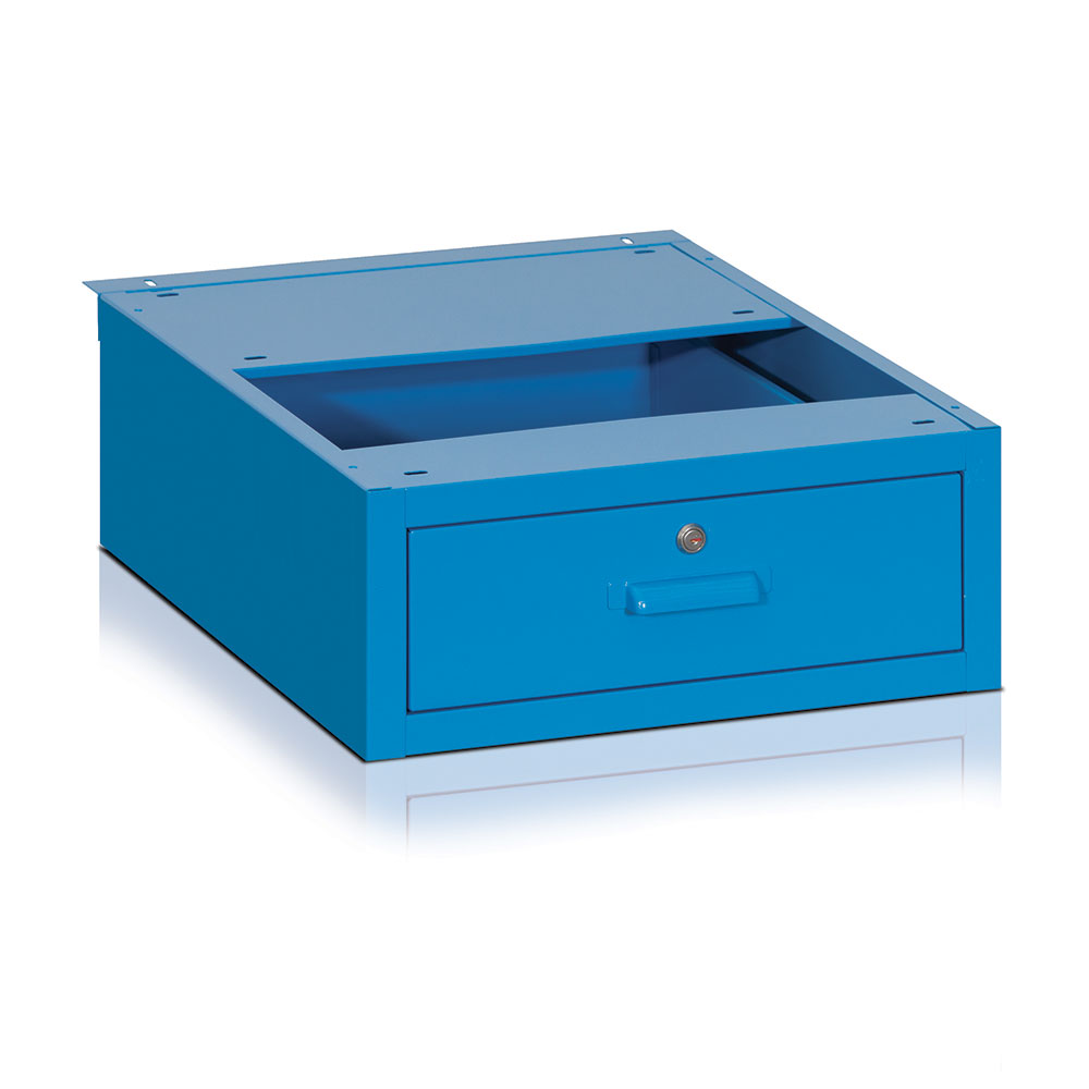 Cassetto pensile in lamiera scorrevole su guide con cuscinetti a sfera e serratura. Verniciatura a polvere blu RAL 5015. Dim.: mm.500x520x200h.