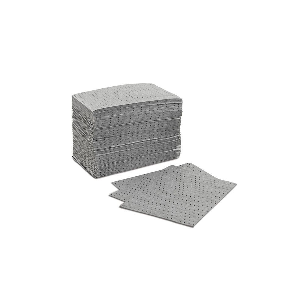 Panni assorbenti universali in fibra di polipropilene di elevata qualità, per liquidi a base acquosa o a base olio, solventi, acetone, benzina, di mm.500x400, assorbenza lt. 0,46 per panno, conf. 200 pz. Grigio.