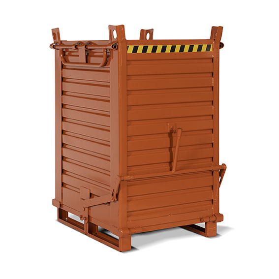 Contenitore in lamiera sagomata e rinforzata completo di maniglie per il sollevamento con carrello elevatore, fondo apribile al centro, sovrapponibile 1+2. Dotato di catene di sicurezza per la leva di sgancio e per l'ancoraggio al carrello elevatore. Portata kg.2000. Dichiarazione di conformità. Verniciatura a polvere arancio RAL 2001. Dim.: mm.1000x800x1250 + piede 110h.