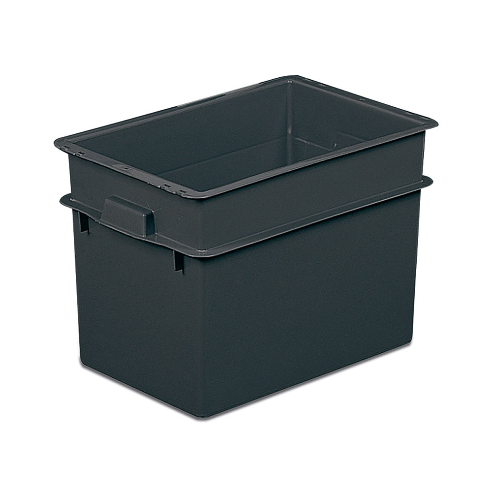 Contenitore in polipropilene, sovrapponibile solo con coperchio 1+2. Inforcabile e inseribile a vuoto. Inattaccabile da alcali, oli, solventi e acidi. Capacità lt.200. Nero. Dim. esterne: mm.800x600x550h. Dim. utili: mm.675/730x490/540x545h.