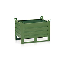 Contenitore in lamiera sagomata e rinforzata con slitta, sovrapponibile 1+3. Portata kg.800. Verniciatura a polvere per esterno verde RAL 6011. Dim.: mm.800x600x400h + piede 130h.