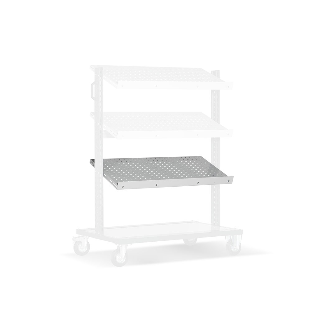 Mensola forata, utilizzabile sia in orizzontale che inclinata. Portata kg.25. Verniciatura a forno grigio chiaro RAL 7035. Dim: mm.950x455x35h