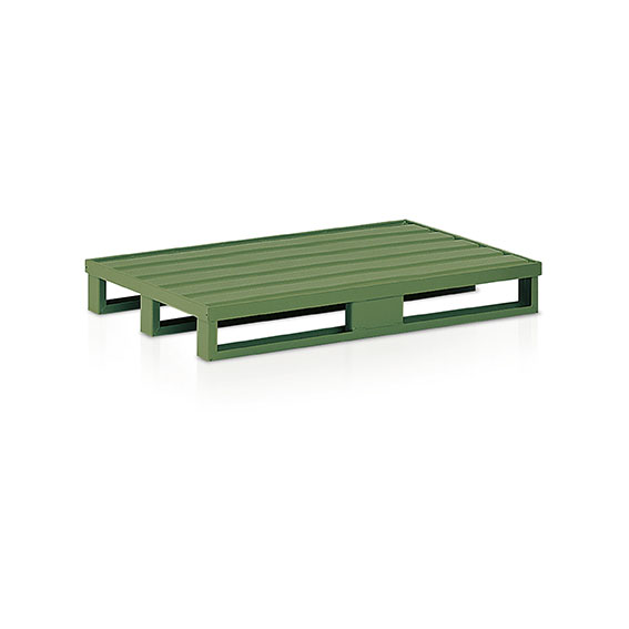 Pallet in lamiera sagomata e rinforzata con slitta. Portata kg.2000. Verniciatura a polvere per esterno verde RAL 6011. Dim.: mm.1200x800x160h.