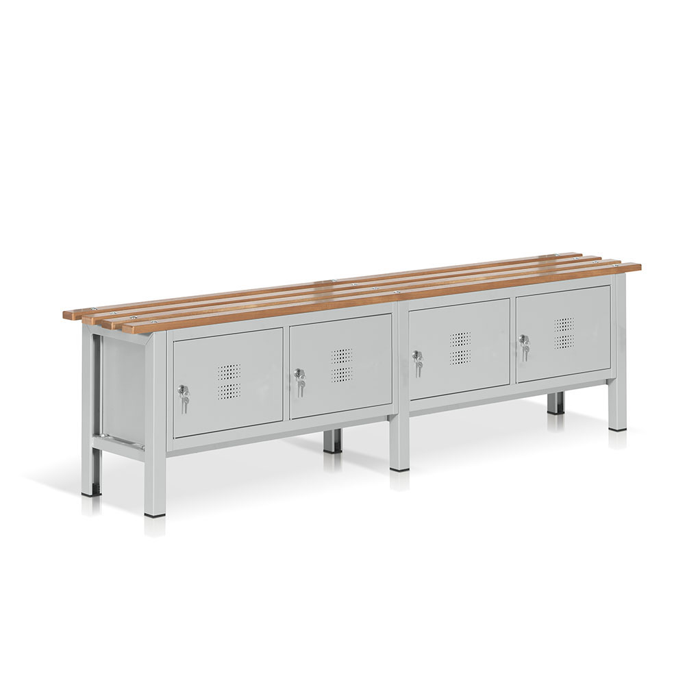 Panca con seduta a 4 doghe in legno di noce bahia e struttura in profilato a "U", con 4 vani in lamiera portascarpe, inseriti ad incastro in ogni modulo, con serratura a linguetta e fori di areazione. Spazio utile vano portascarpe: mm.335x300x240h. Smontata. Verniciatura a polvere grigio RAL 7038. Dim.: mm.2000x320x490h.