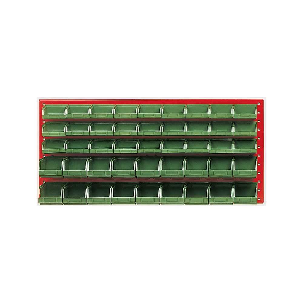 Pannello in lamiera corredato di contenitori verdi, 27 P249 e 18 P250. Verniciatura a polvere rosso RAL 3002. Dim.: mm.1000x178x455h.