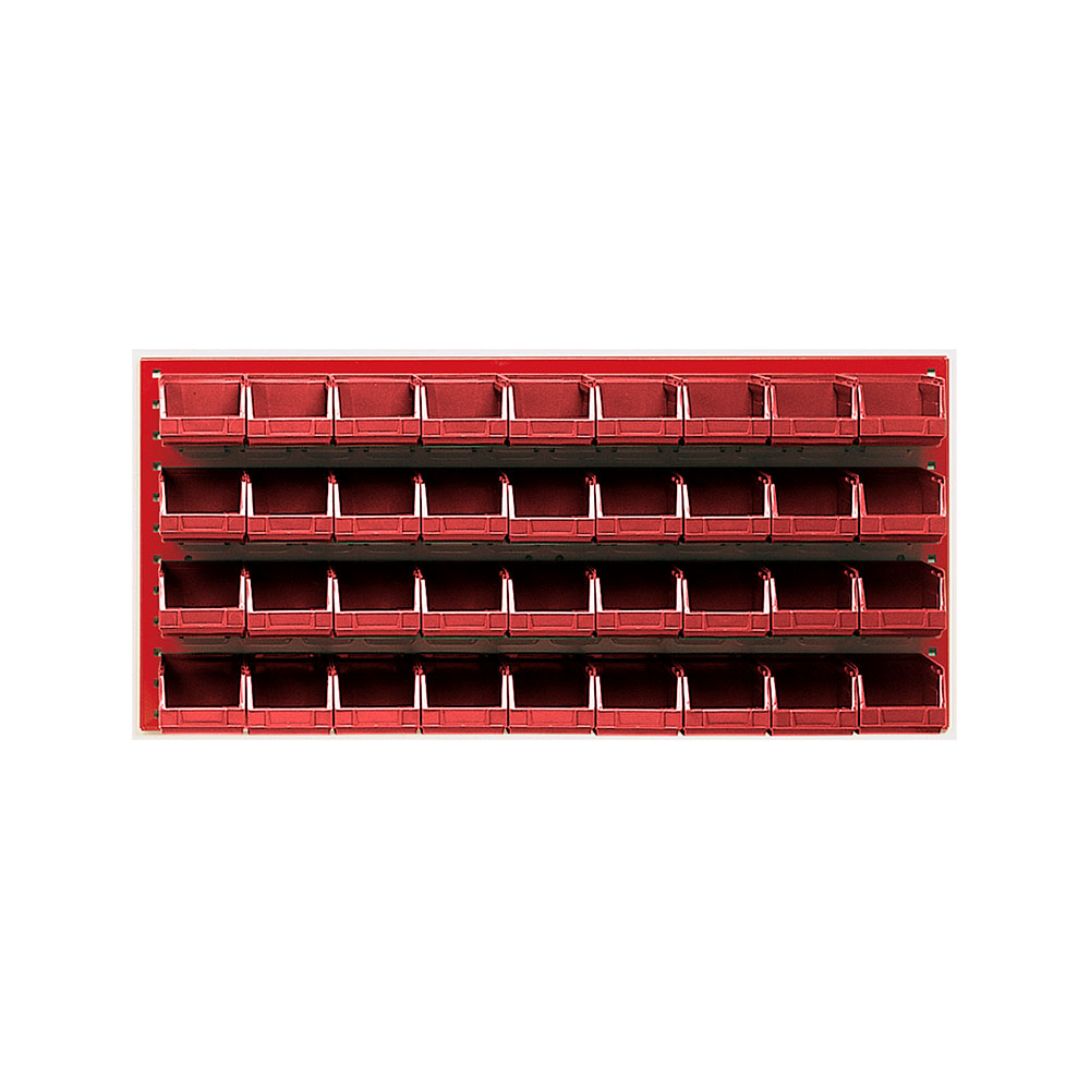 Pannello in lamiera corredato di 36 contenitori P250 rossi. Verniciatura a polvere rosso RAL 3002. Dim.: mm.1000x178x455h.
