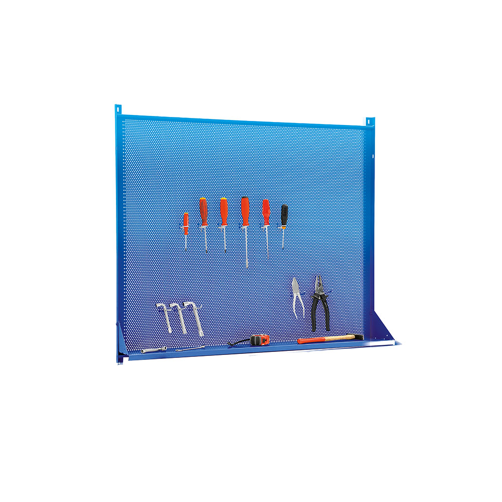 Pannello portachiavi in lamiera forata con mensola smontabile. Verniciatura a polvere blu RAL 5015. Dim.: mm.1000x140x850h.