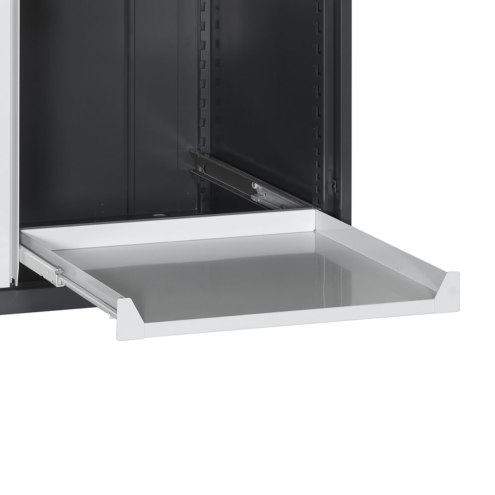 Piano in lamiera ad estrazione telescopica. Portata 75 Kg. Verniciatura a polvere grigio chiaro RAL 7035. Dim.: mm.600x600x75h.
