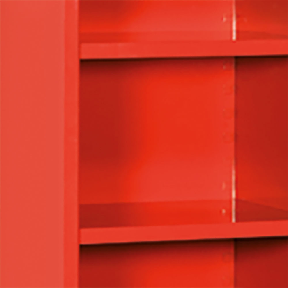 Piano in lamiera per armadi 0952-0956. Portata kg.50. Verniciatura a polvere rosso RAL 3000. Dim.: mm.525x475x30h.