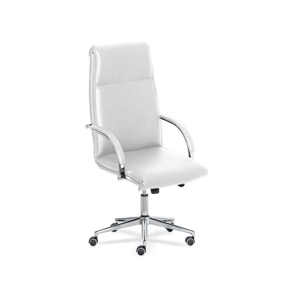Poltrona direzionale ACQUARIO, schienale alto. Monoscocca in multistrato di faggio imbottita e rivestita in ecopelle bianca. Braccioli in acciaio cromato con poggia braccia. Oscillante con bloccaggio in 3 posizioni. Basamento in acciaio cromato con ruote gommate.
