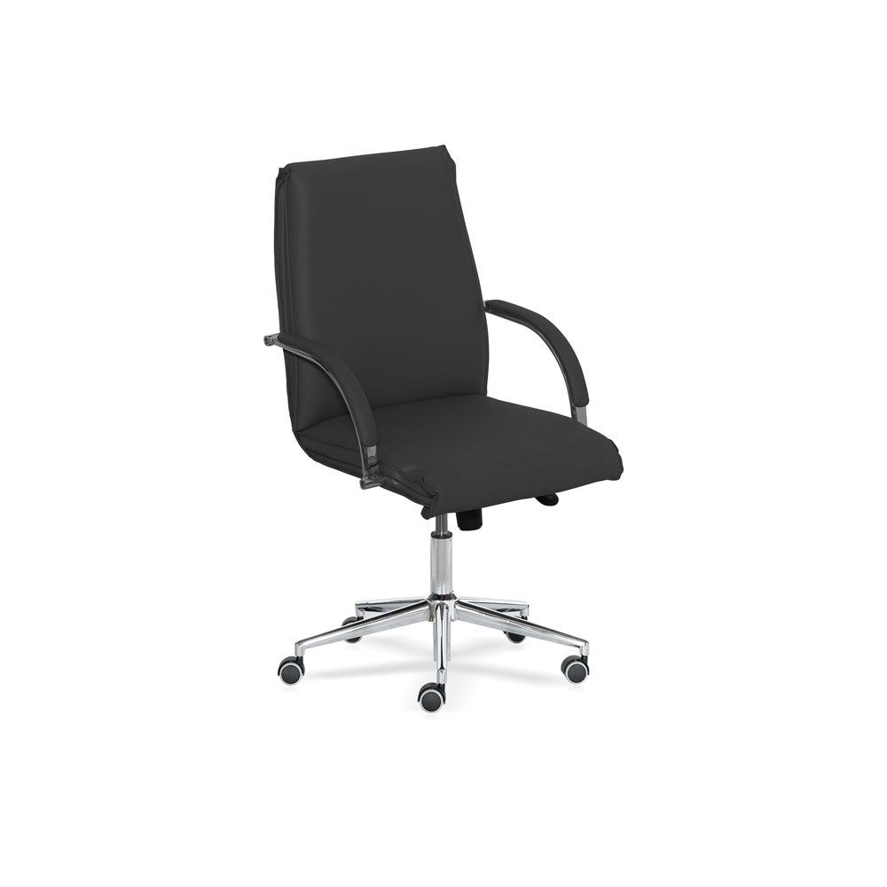 Poltrona direzionale ACQUARIO, schienale medio. Monoscocca in multistrato di faggio imbottita e rivestita in ecopelle nera. Braccioli in acciaio cromato con poggia braccia. Oscillante con bloccaggio in 3 posizioni. Basamento in acciaio cromato con ruote gommate