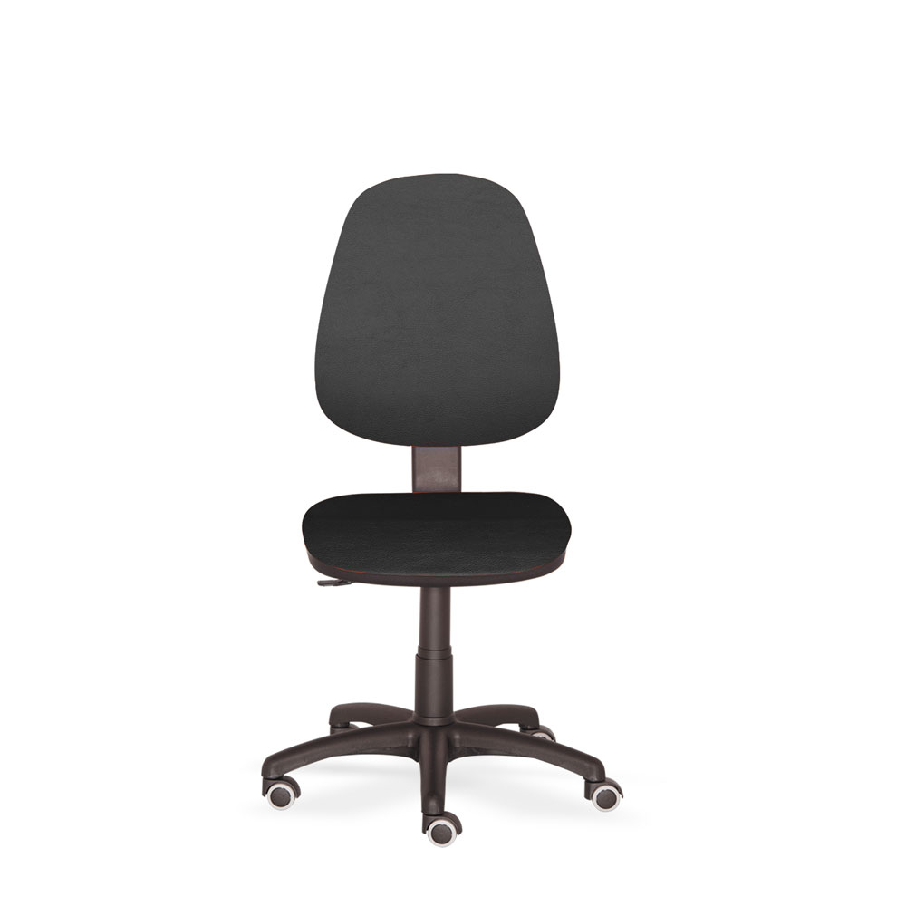 Poltrona operativa GEMMA imbottita e rivestita in ecopelle nera, schienale regolabile in altezza e contatto permanente. Basamento in poliammide rinforzato con ruote gommate. Elevazione a gas.