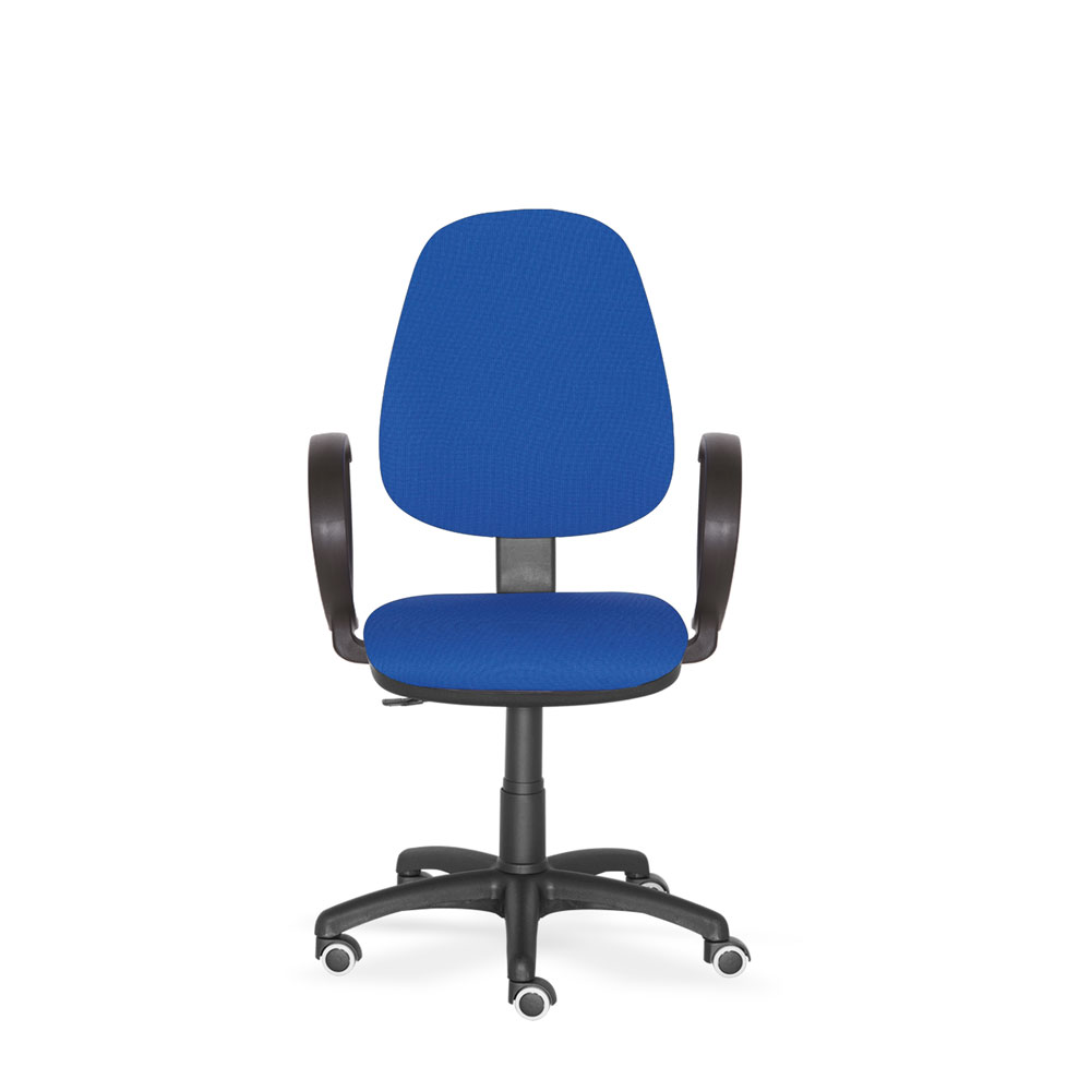 Poltrona operativa GEMMA imbottita e rivestita in tessuto ignifugo blu. Braccioli in polipropilene,schienale regolabile in altezza e contatto permanente. Basamento in poliammide rinforzato con ruote gommate. Elevazione a gas.