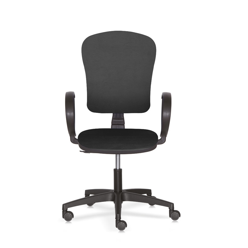 Poltrona operativa NUOVA ANTARES, schienale alto, imbottita e rivestita in ecopelle nera. Braccioli in polipropilene. Schienale regolabile in altezza e contatto permanente. Basamento in nylon rinforzato con ruote gommate. Elevazione a gas.