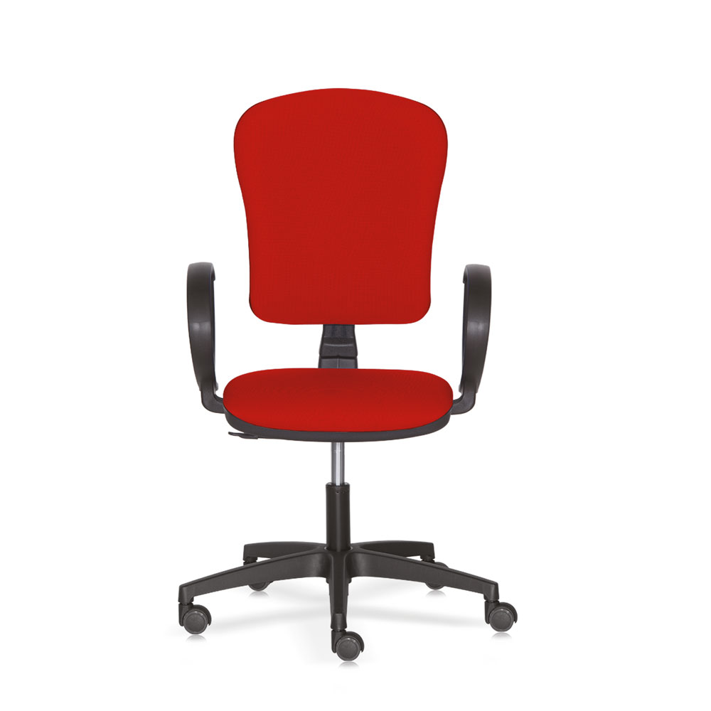 Poltrona operativa NUOVA ANTARES, schienale alto, imbottita e rivestita in tessuto ignifugo rosso. Braccioli in polipropilene. Schienale regolabile in altezza e contatto permanente. Basamento in nylon rinforzato con ruote gommate. Elevazione a gas.