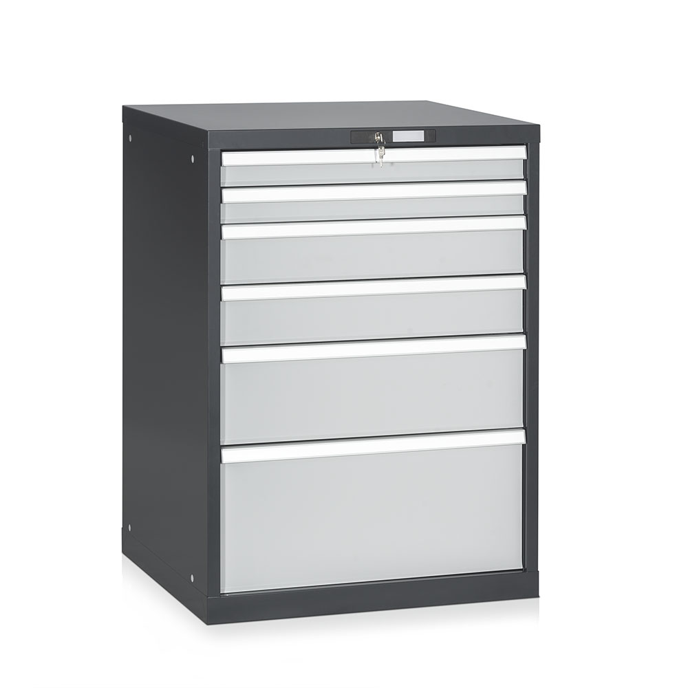 Portautensili in lamiera con dispositivo antiribaltamento, 6 cassetti ad estrazione telescopica con portata kg.75, 2 di mm.75h, 2 di mm.125h, 1 di mm.200 ed 1 di mm.300h. Verniciatura a polvere antracite RAL 7016 per la scocca e grigio chiaro RAL 7035 per i cassetti. Dim.: mm.717x725x1000h.