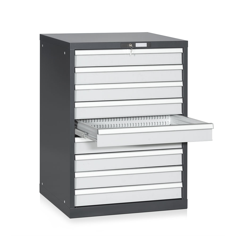 Portautensili in lamiera con dispositivo antiribaltamento, 9 cassetti ad estrazione telescopica con portata kg.75 di mm 100h. Verniciatura a polvere antracite RAL 7016 per la scocca e grigio chiaro RAL 7035 per i cassetti. Dim.: mm.717x725x1000h.