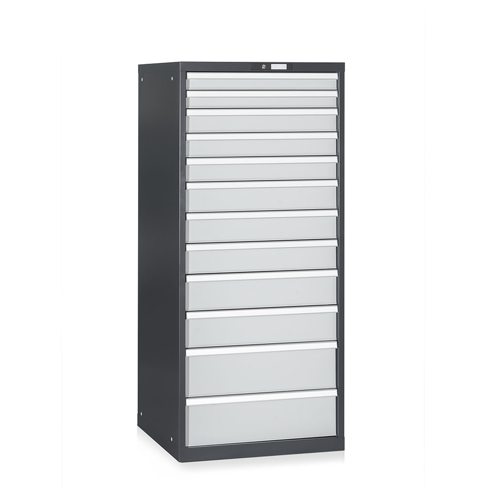 Portautensili in lamiera con dispositivo antiribaltamento, 12 cassetti ad estrazione telescopica con portata kg.75, 2 di mm.75h, 3 di mm.100h, 3 di mm.125h, 2 di mm.150h e 2 di mm.200h. Verniciatura a polvere antracite RAL 7016 con cassetti grigio chiaro RAL 7035. Dim.: mm.717x725x1625h.