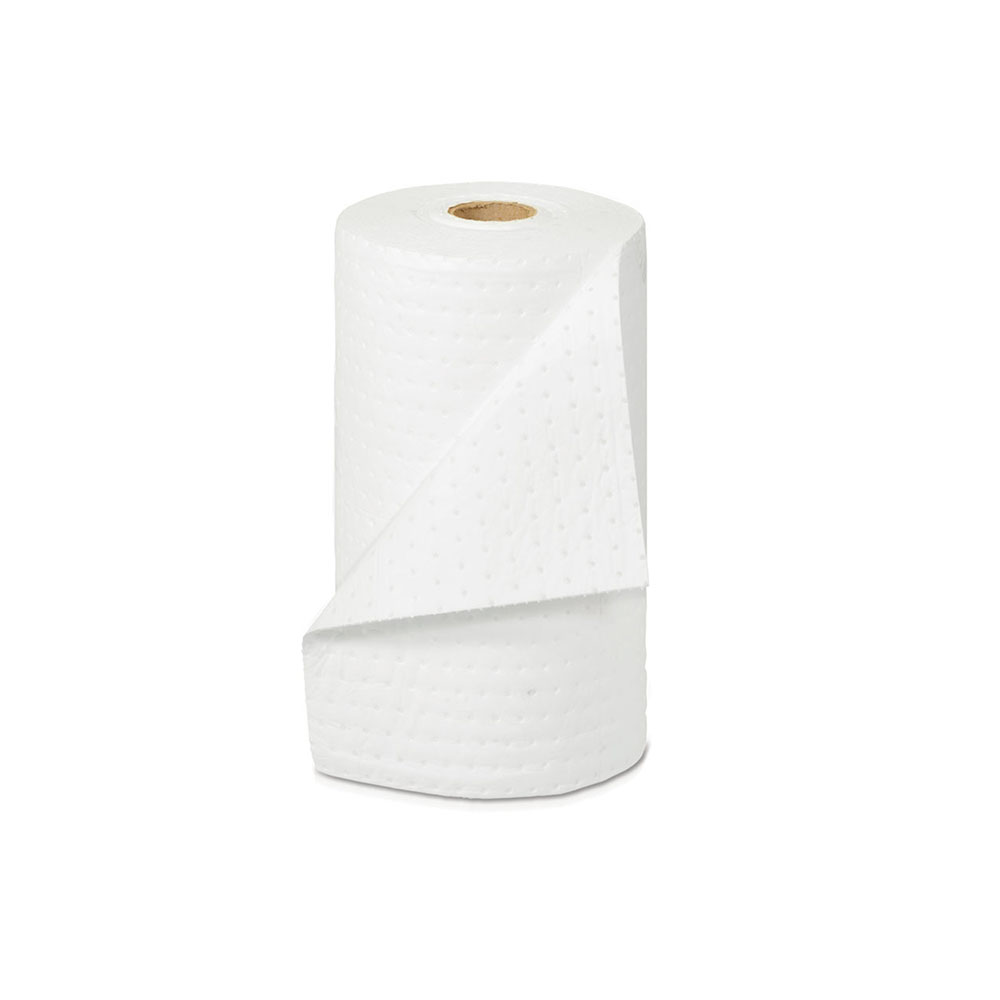 Rotolo assorbente per oli, idrocarburi e derivati, in fibra di polipropilene di elevata qualità, non assorbono acqua e galleggiano anche saturi, di m.40x0,5h, assorbenza lt. 95 per rotolo. Bianco.