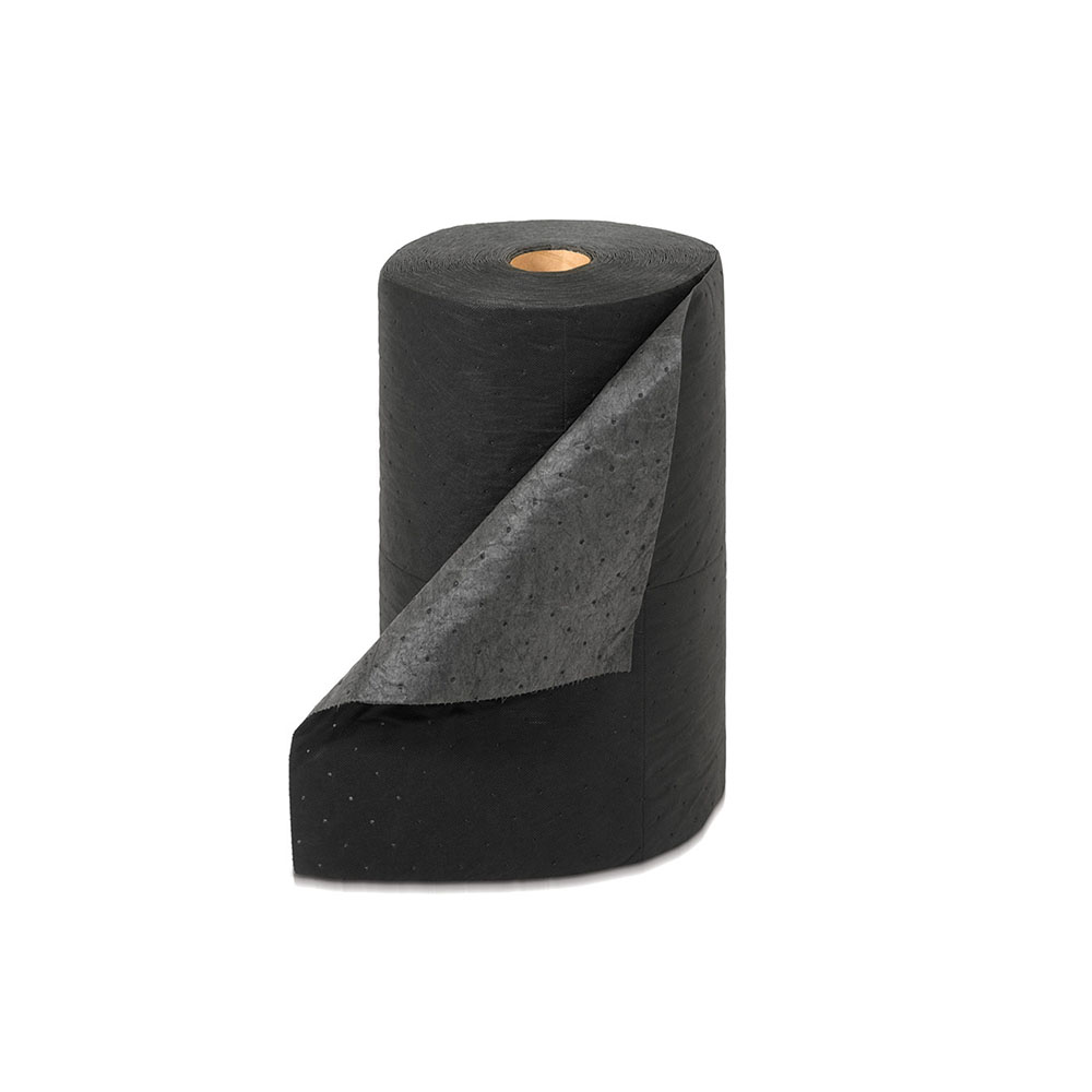 Rotolo assorbente universale in fibra di polipropilene di elevata qualità, per liquidi a base acquosa o a base olio, solventi, acetone, benzina, di m.40x0,5h, assorbenza lt. 95 per rotolo. Nero.