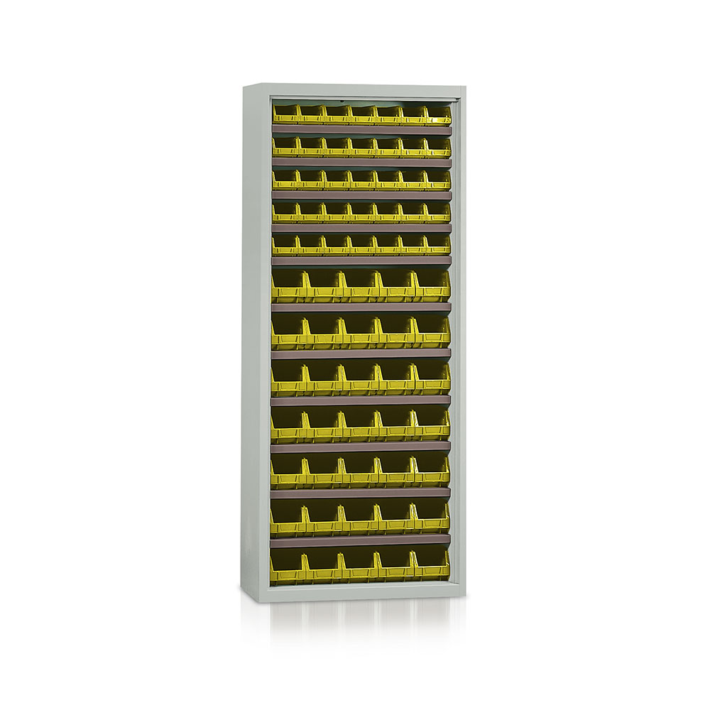 Armadio corredato di contenitori gialli, 35 P250 e 35 P251. Verniciatura a polvere grigio RAL 7038 per la scocca, piani zincati. Dim.: mm.840x270x2000h.