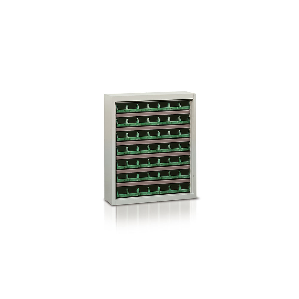 Armadio corredato di 49 contenitori P250 verdi. Verniciatura a polvere grigio RAL 7038 per la scocca, piani zincati. Dim.: mm.840x270x990h.