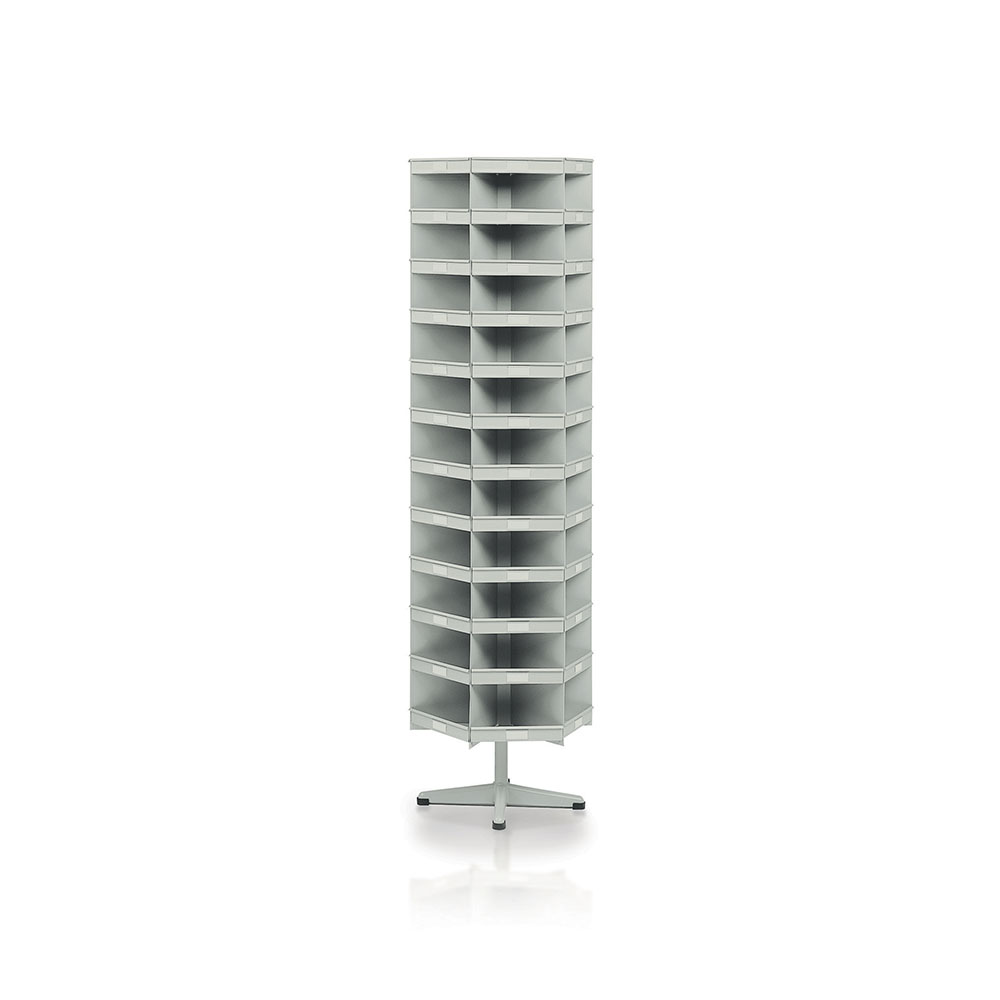 Scaffale girevole con basamento fisso in lamiera sp.7/10 a 66+6 caselle di mm.35/235x175x125h. Verniciatura a polvere grigio RAL 7038. Dim.: mm.435x490x1690h.