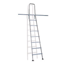 Scala agganciabile in acciaio inox AISI 441 (EN 1.4509) a 7 gradini in alluminio antisdrucciolevoli. Portata kg.150. Conforme UNI EN 131-2. H. totale mm.2500, h. utile mm.1720, h. binario da mm.1750 a mm.2000, h. lavoro mm.3570.