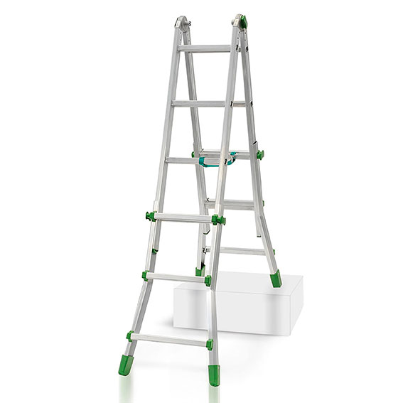 Scala professionale multiuso in alluminio anodizzato a 3/4 gradini esterni/interni. Gradini antisdrucciolevoli esterni saldati e interni ribordati. Cerniera automatica con 2 posibilità di uso: libero per aprire e chiudere la scala oppure bloccato nella posizione di apertura massima. Portata kg.150. Conforme D.Lgs. 81/08. Dim.: mm.520x1080x1200h. H. totale a libro mm.1700, h. lavoro a libro mm.2850, h. estesa mm.3440, h.lavoro estesa mm.4350.