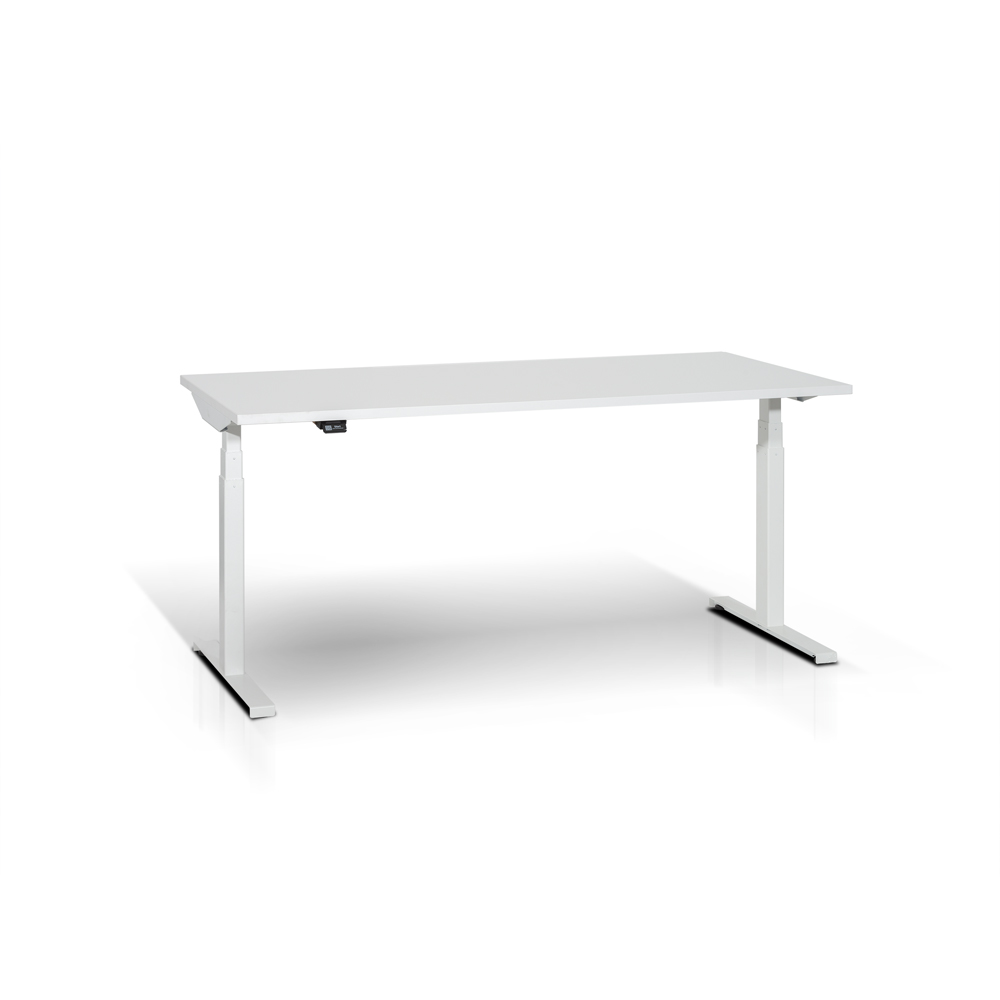 Scrivania con gambe a "T" elevabili elettricamente. Piano in melaminico bianco sp. mm. 25, gambe in acciaio verniciato bianco RAL 9016 con cavo motore da mm. 1550, alimentatore a 230V, cavo connessione da mm. 1800. Dotata di kit anti collisione a sensore. Portata kg. 80. Dim.: mm. 1600x800x585/1235h.