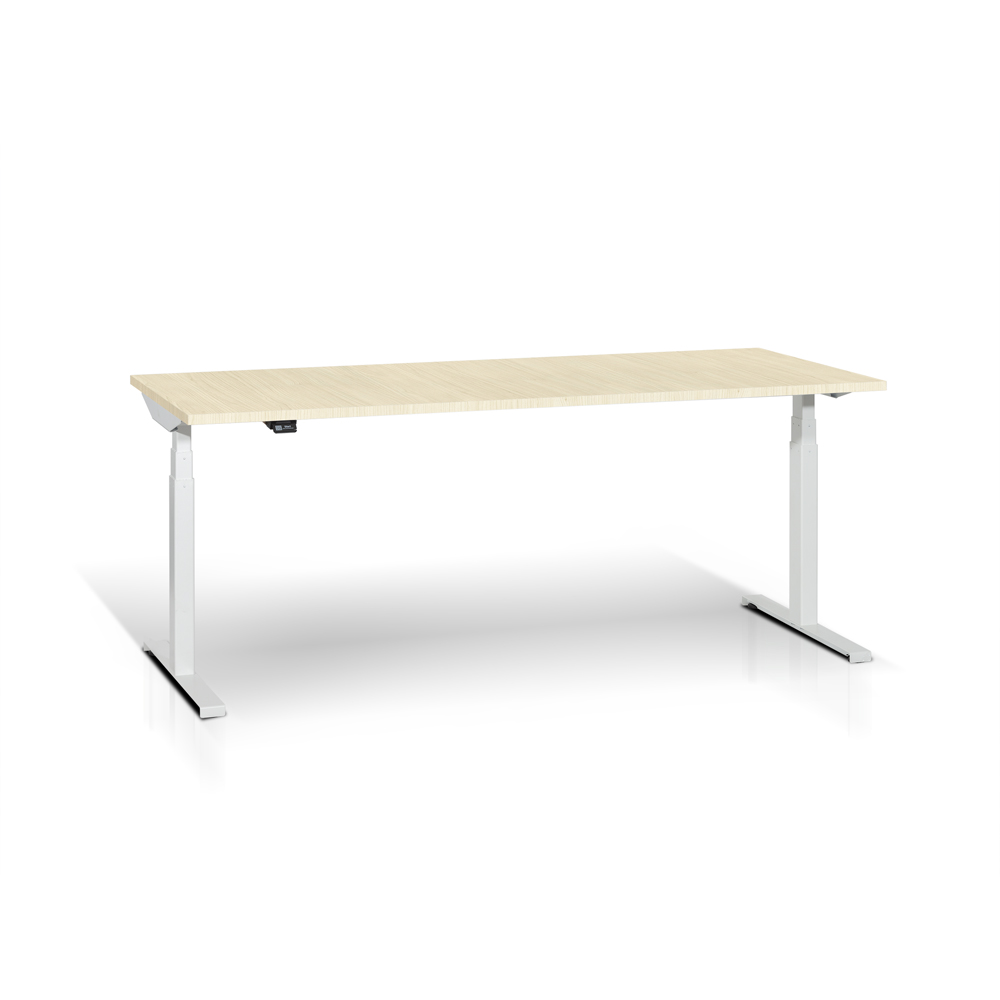 Scrivania con gambe a "T" elevabili elettricamente. Piano in melaminico acero sp. mm. 25, gambe in acciaio verniciato bianco RAL 9016 con cavo motore da mm. 1550, alimentatore a 230V, cavo connessione da mm. 1800. Dotata di kit anti collisione a sensore. Portata kg. 80. Dim.: mm. 1800x800x585/1235h.
