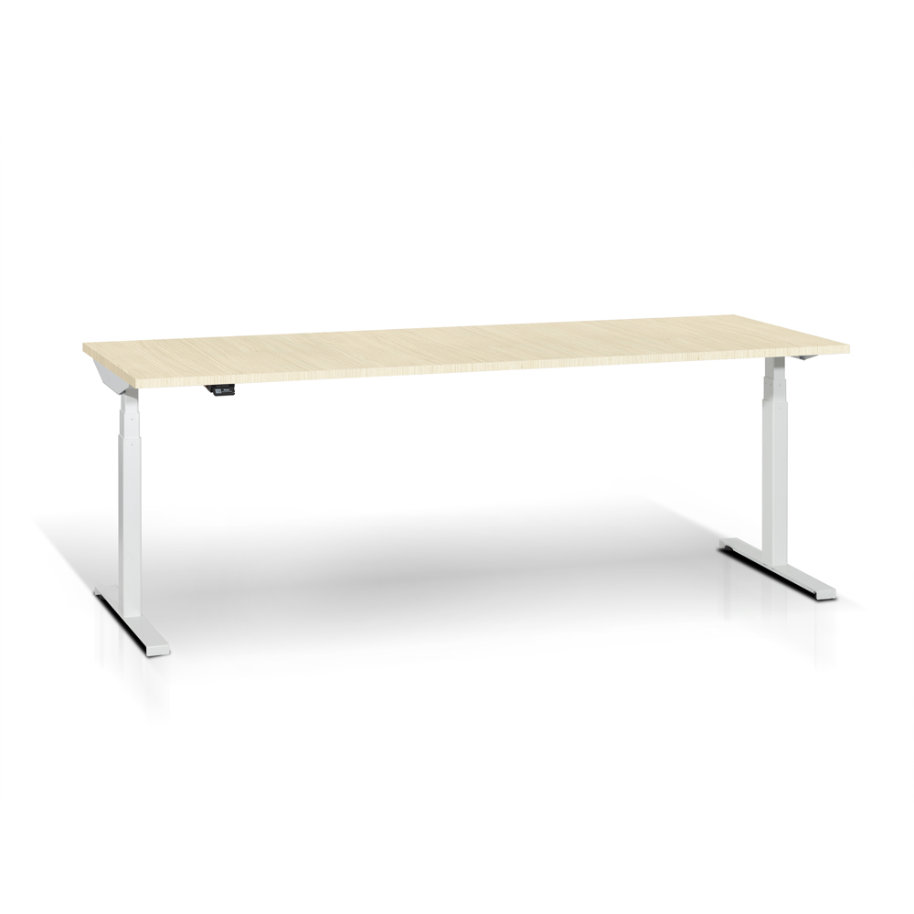 Scrivania con gambe a "T" elevabili elettricamente. Piano in melaminico acero sp. mm. 25, gambe in acciaio verniciato bianco RAL 9016 con cavo motore da mm. 1550, alimentatore a 230V, cavo connessione da mm. 1800. Dotata di kit anti collisione a sensore. Portata kg. 80. Dim.: mm. 2000x800x585/1235h.